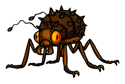 This omnivorous Kreature protects itself with a thick, spiny exoskeleton. It has the ability to retract its legs into its body and roll towards its attackers, smashing into them at high speed; it can also launch its spines in parabolic arcs in all directions. Feral Bugzors will gather in colonies in storm drains, abandoned subway tunnels, and other dark, dingy places, where they'll reproduce in such numbers that they'll cover the walls and ceilings. If their home is invaded, they'll rain spines down upon the intruder.